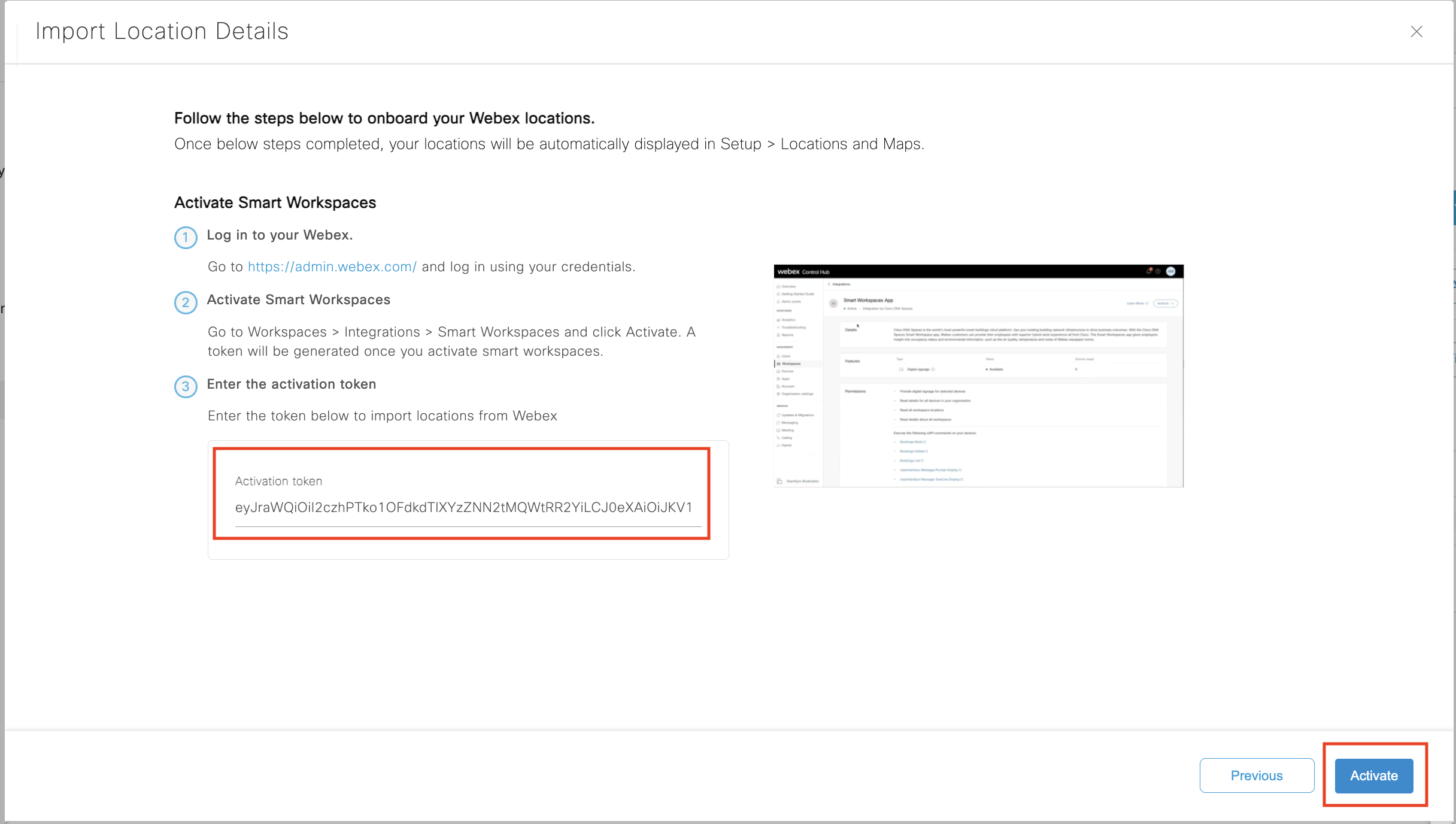 Note: the “green” activated state will only show for the Cisco Spaces admin that pasted the token in the field.