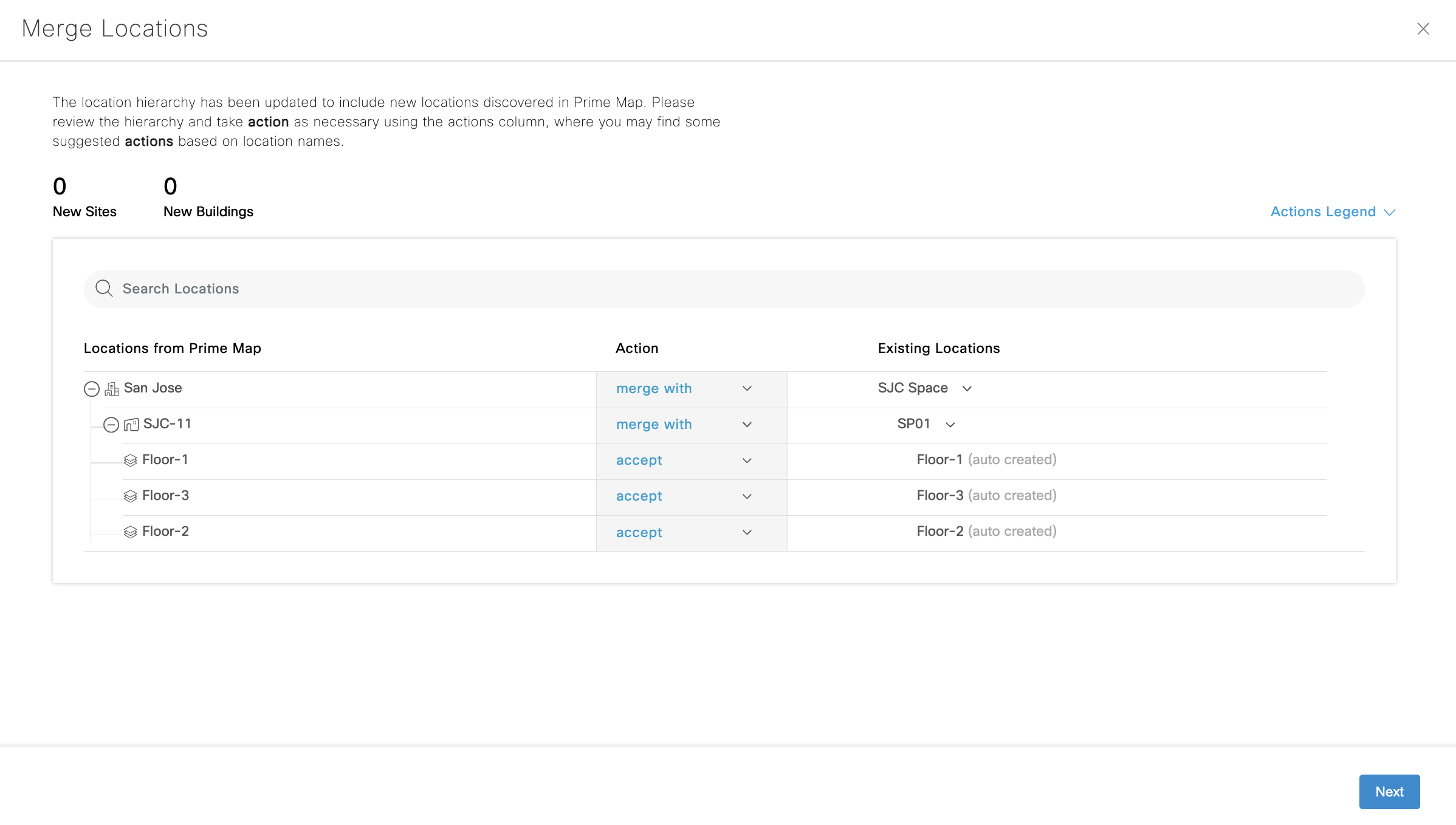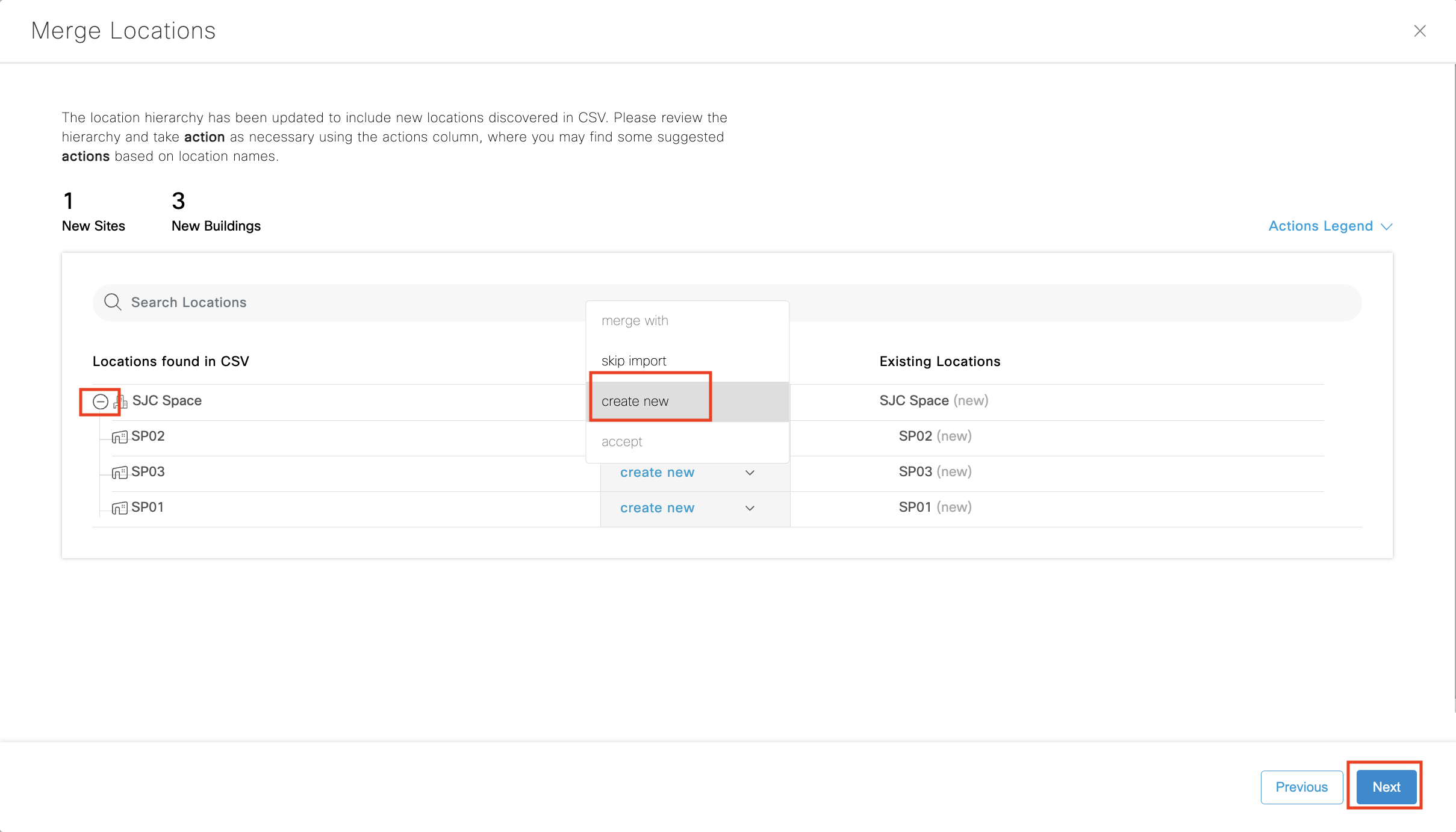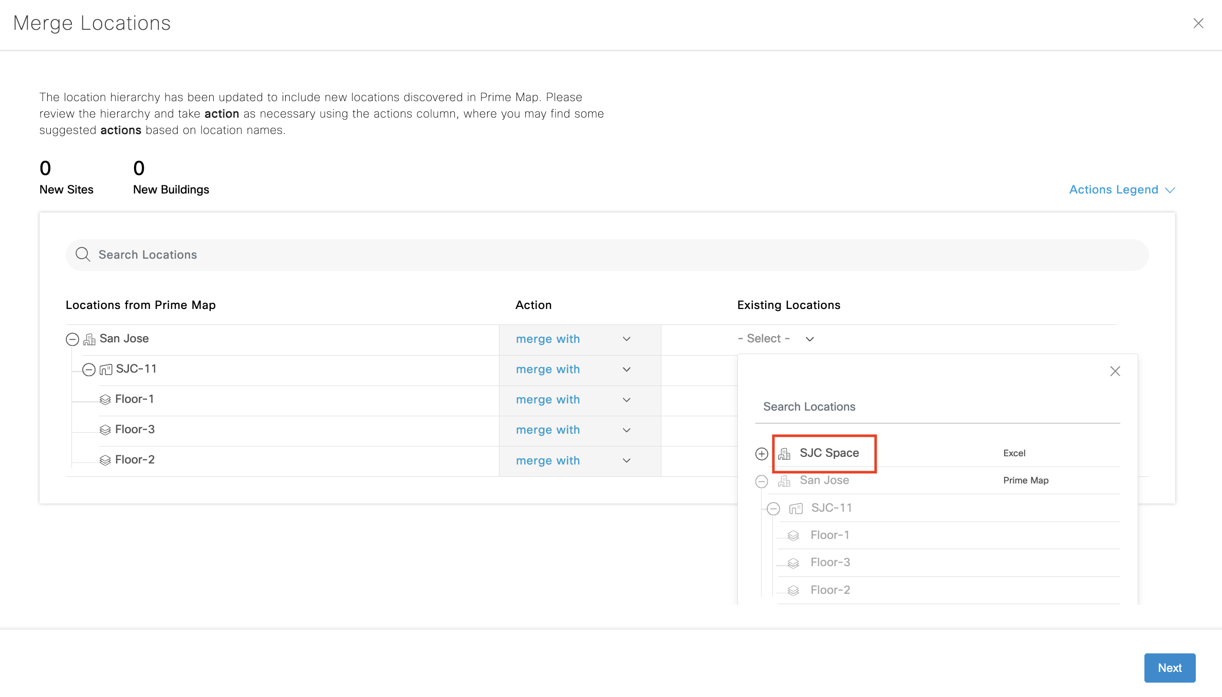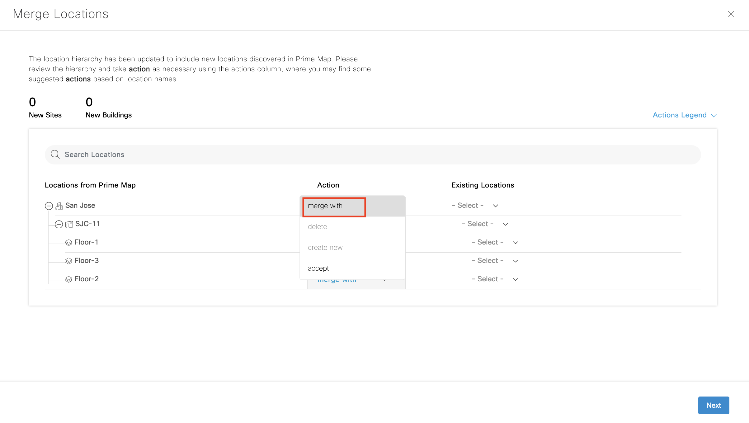 Choose ‘merge with’ to merge same location hierarchies that would have been previously created through Excel sheet upload, DNAC sync, etc. Remember to merge floors, too.