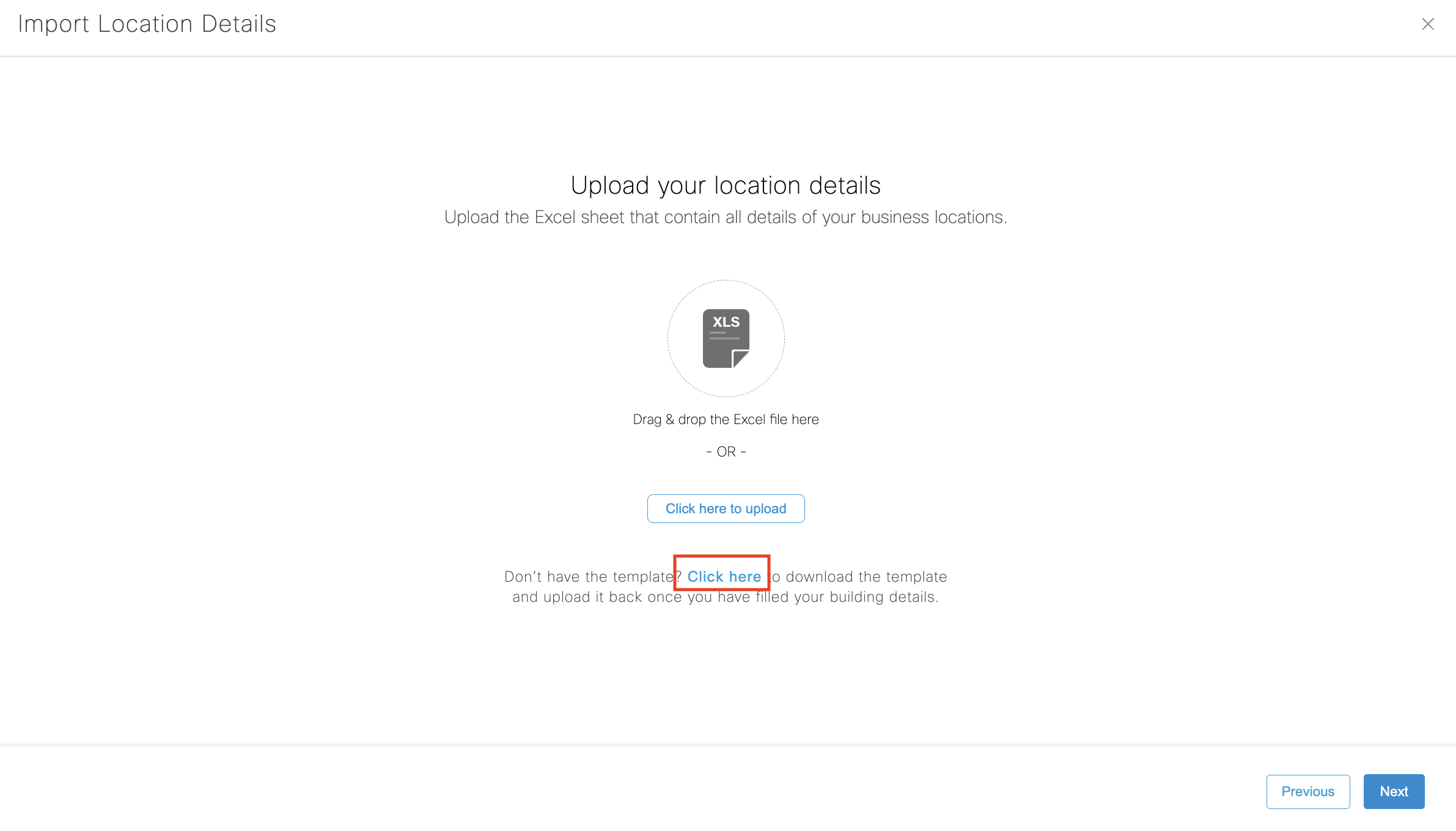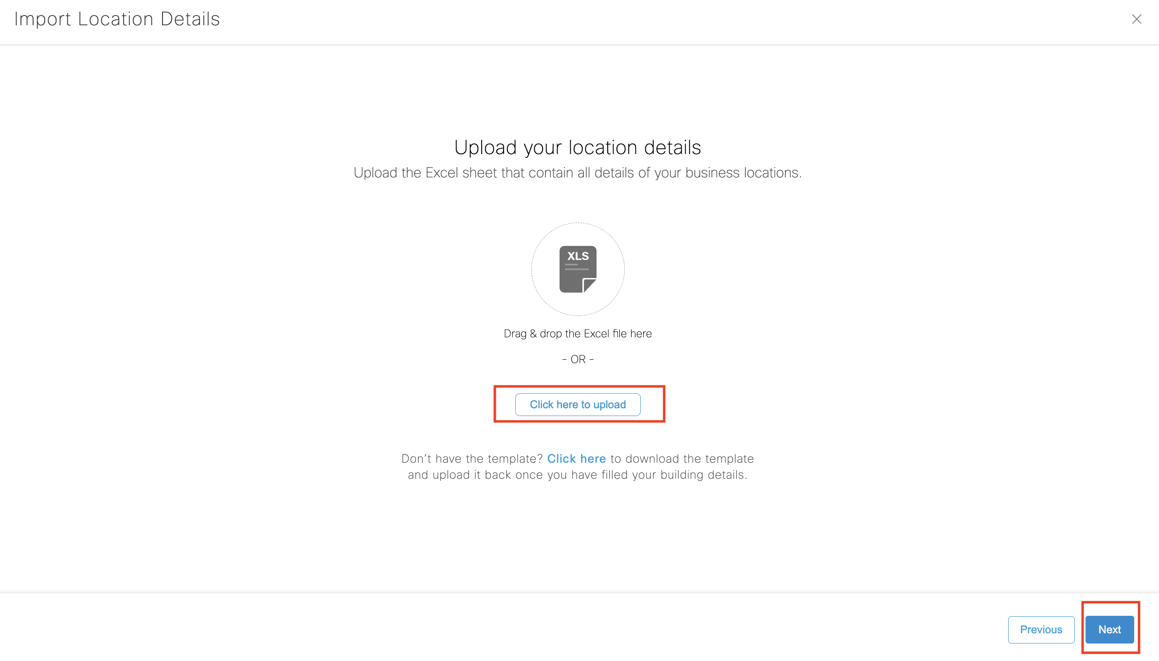 Once the Excel sheet is ready with the required data Click on ‘Click here to upload’ to upload the file and Select “Next”