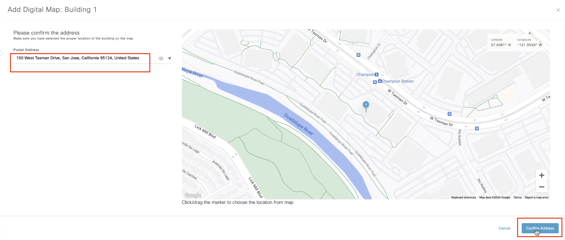 Verify if the location pin is on the right address, if not, you can drag and drop the pin on the center or the focus area of the building. This will be the default center or focus area in other Spaces apps. Click on “Confirm Address”. Locations with an incorrect street address (must match the physical building outline) will be rejected.