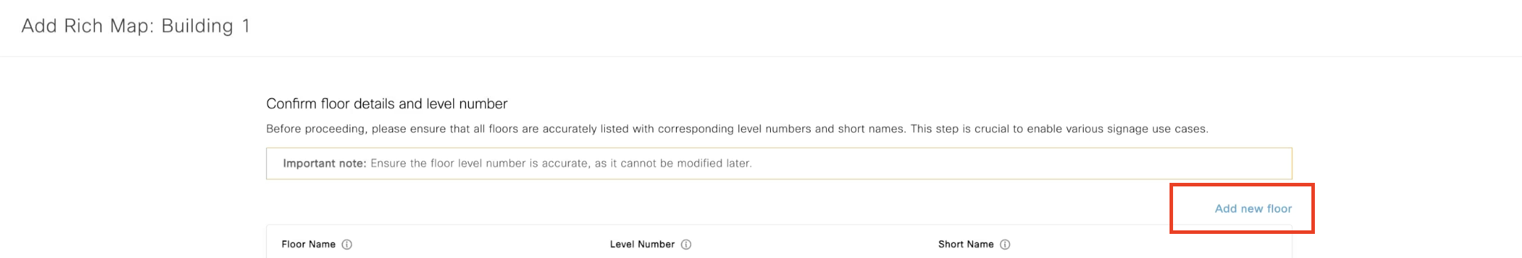 Add missing metadata to the floors. Enter floor details and level number. Ensure that all floors are accurately listed with corresponding level numbers and short names as it cannot be modified without re-uploading files later.