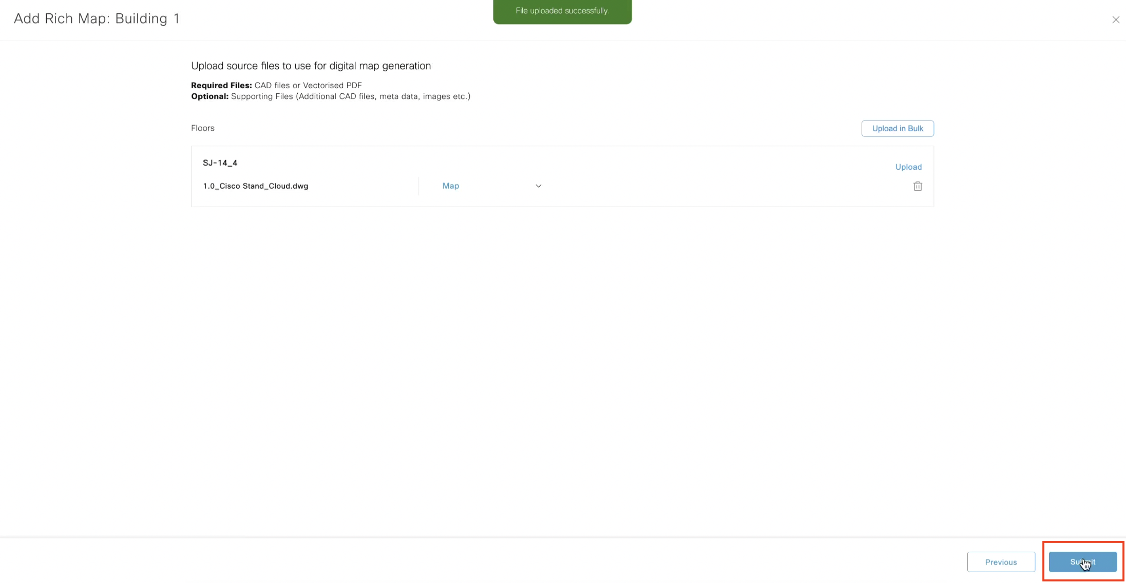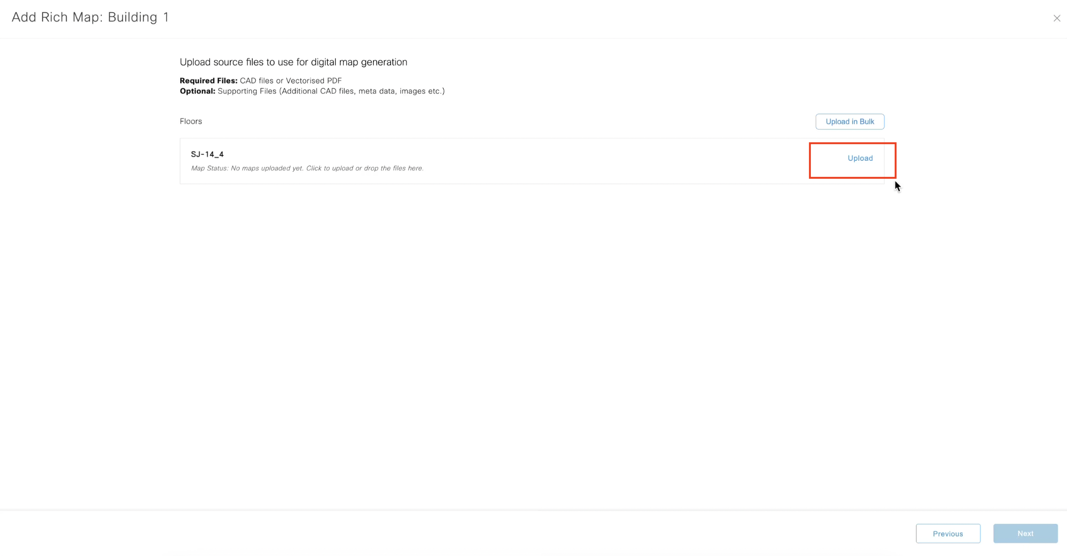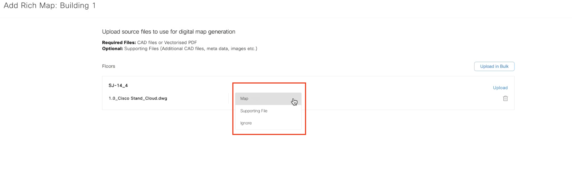 CAD files can be bundled into a ZIP file and uploaded at a building level using the “Bulk Upload” option or on a floor-by-floor basis with individual file upload per floor. Floorplans files must contain a single floor per file. Multipage vector PDFs and CAD files with multiple floor drawings will be rejected.