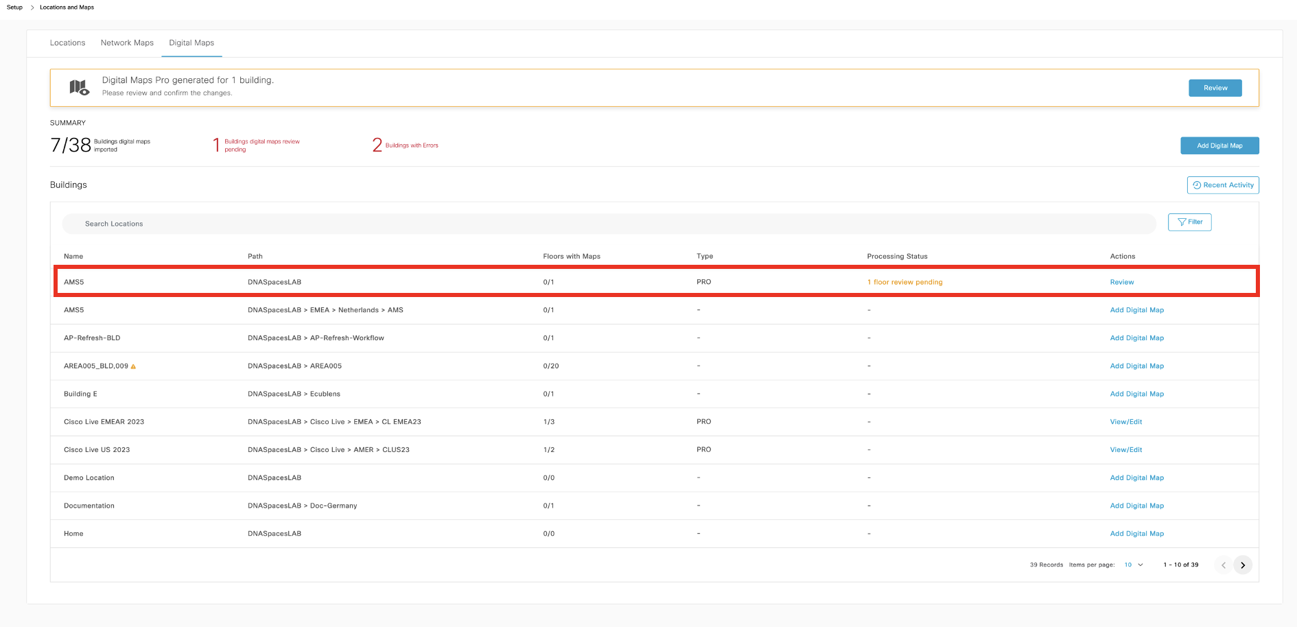 Once processed, Processing Status changes to ‘review pending’. Click on “Review” to view unpublished Digital Maps.