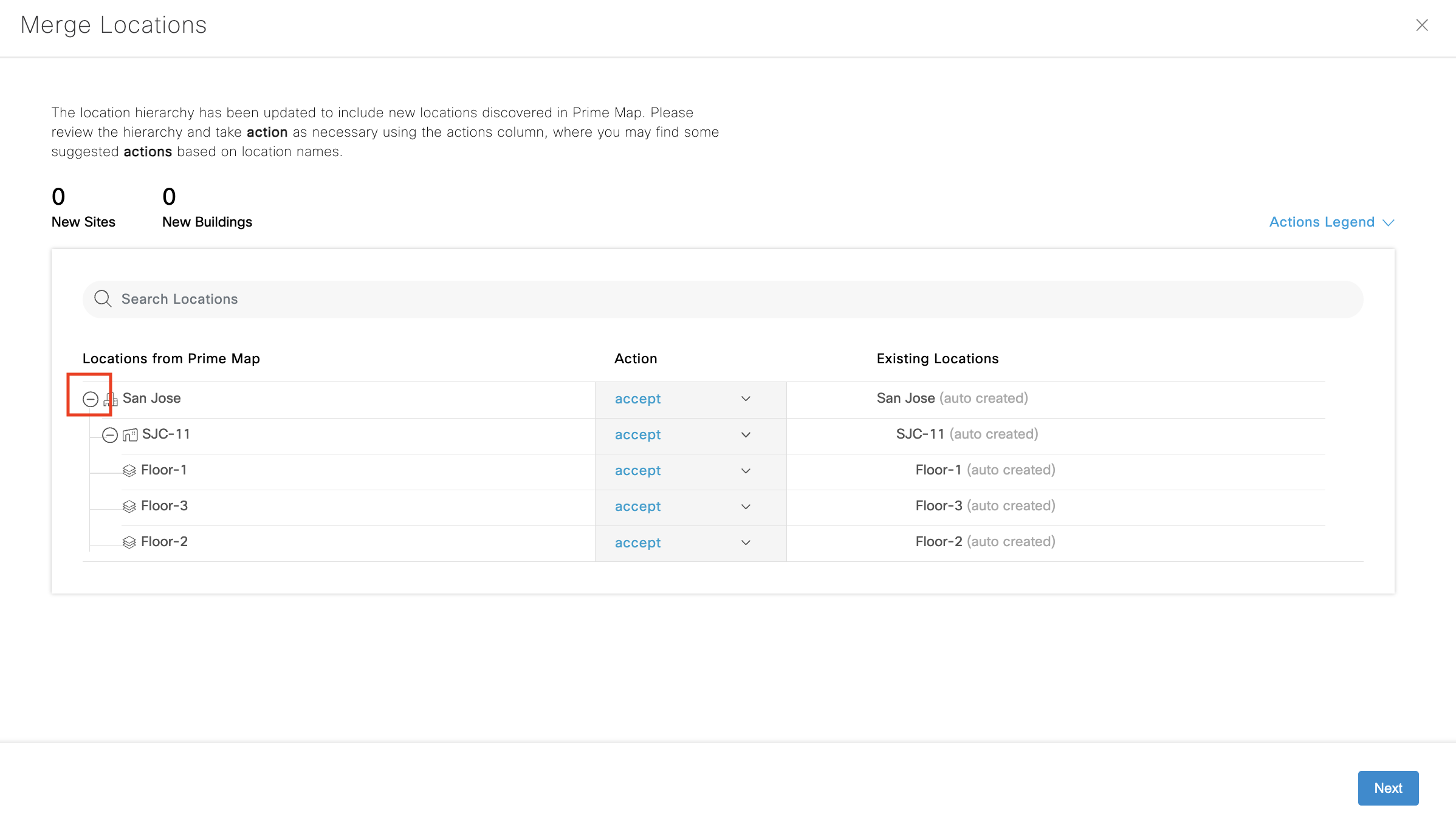 Choose ‘merge with’ to merge same location hierarchies that would have been previously created through Excel sheet upload, DNAC sync, etc. Remember to merge floors, too.
