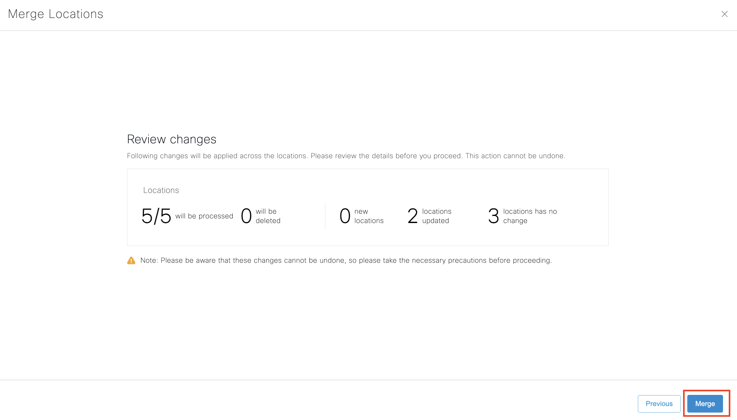 Choose the location that needs to be merged from the dropdown under Existing Locations.