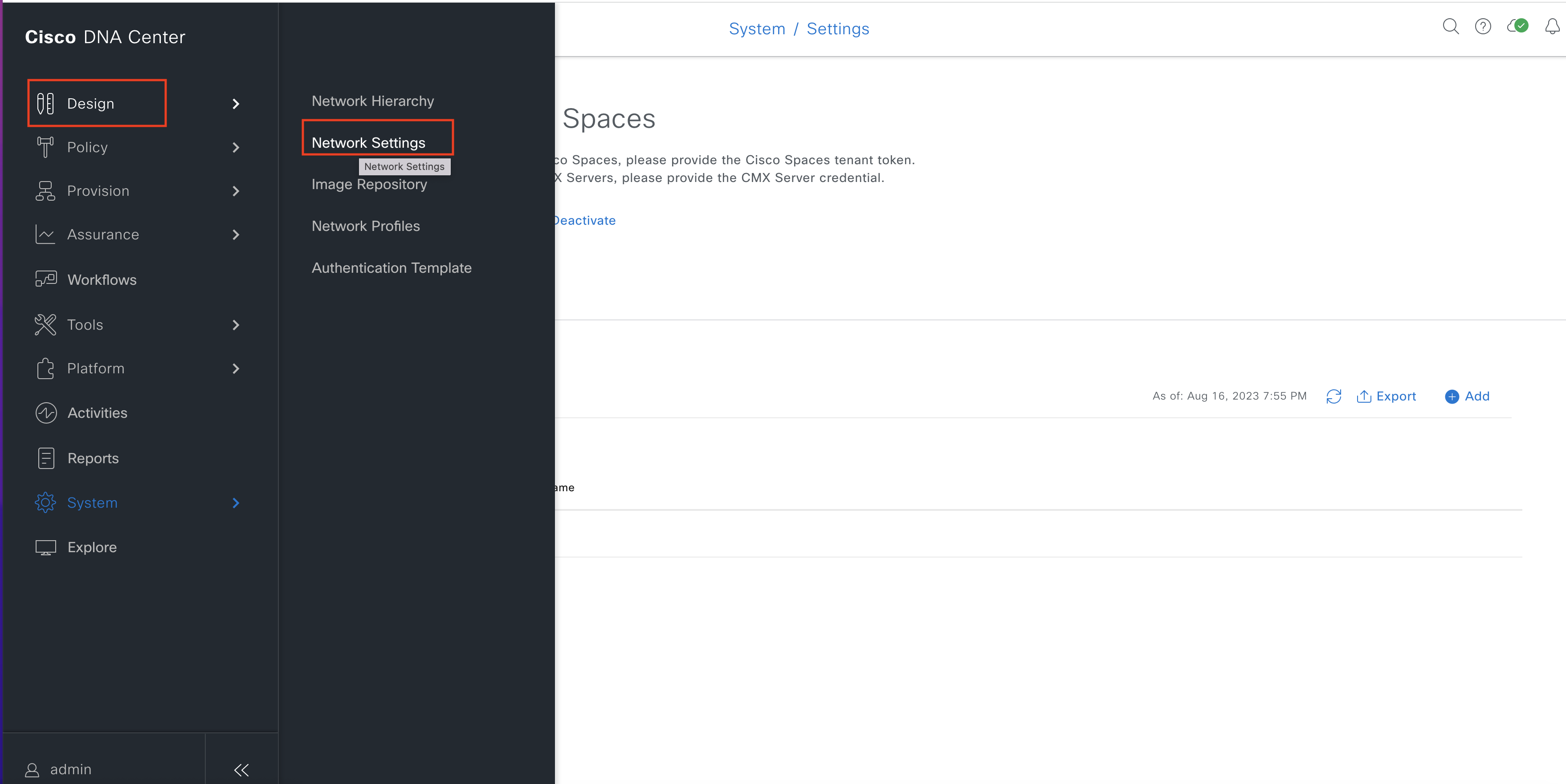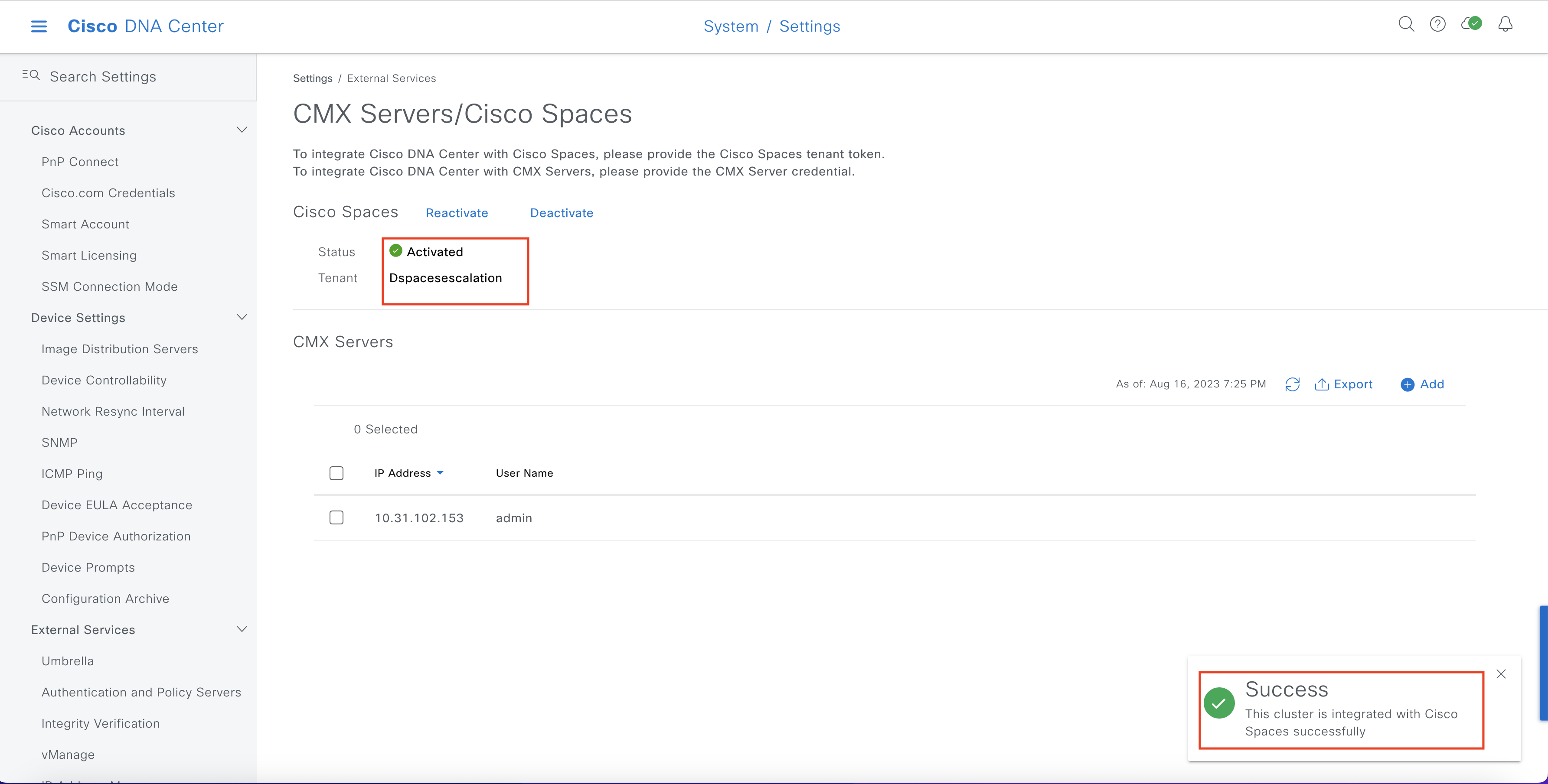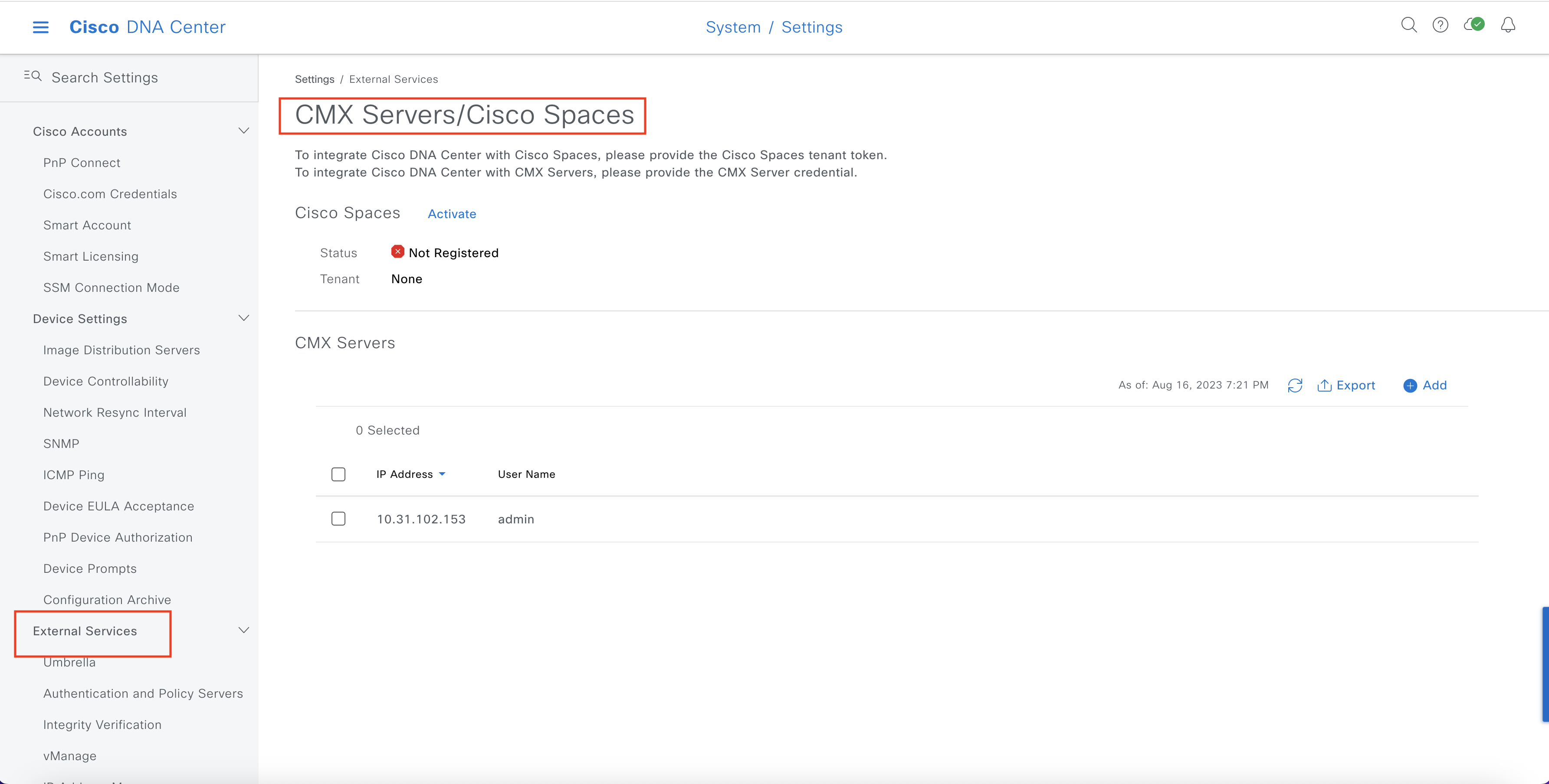 Choose System > Settings > External Services > CMX Servers/Cisco Spaces.