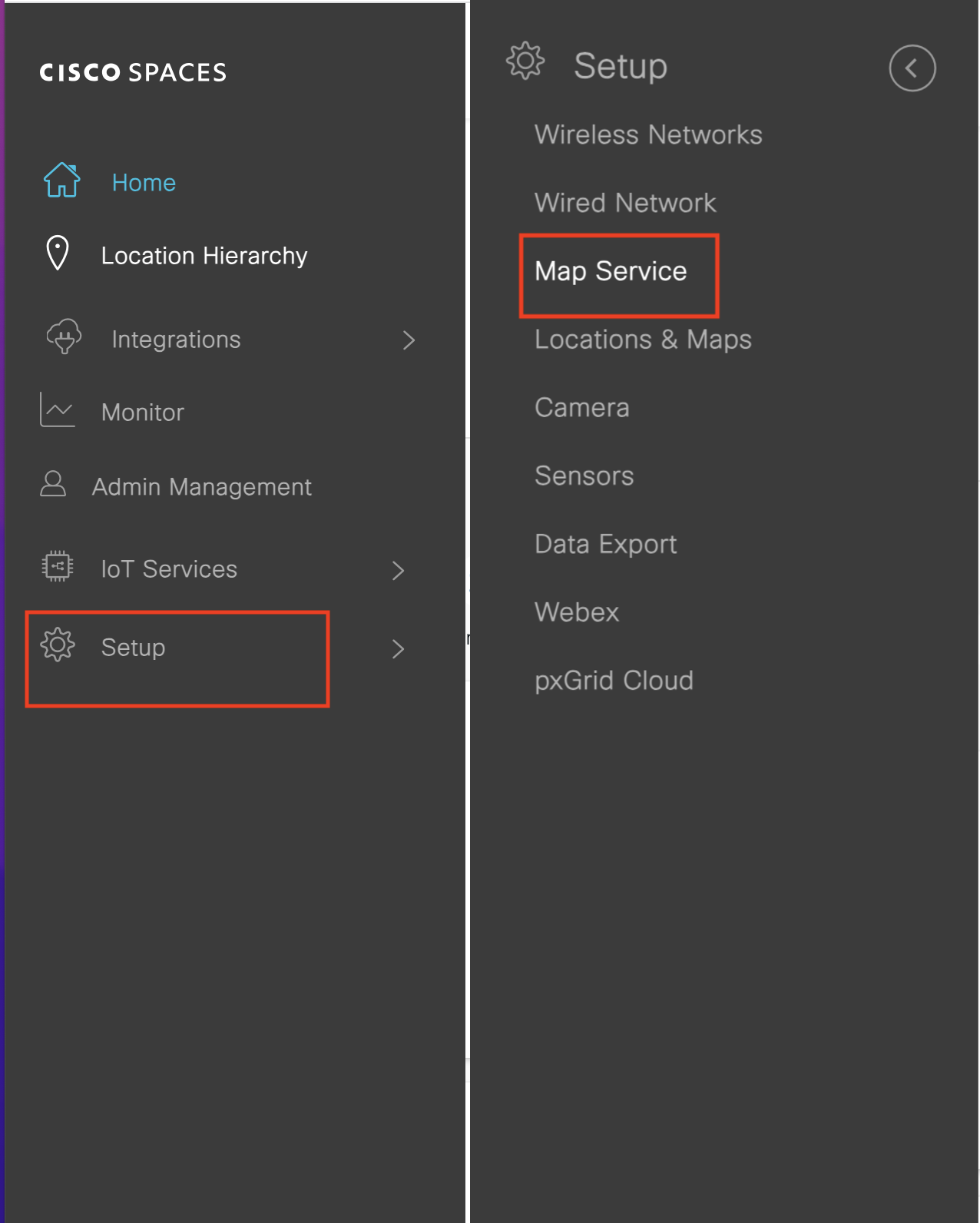 • To check if maps are synced successfully in Map Service. Click on the three-line Menu icon > Setup > Map Service