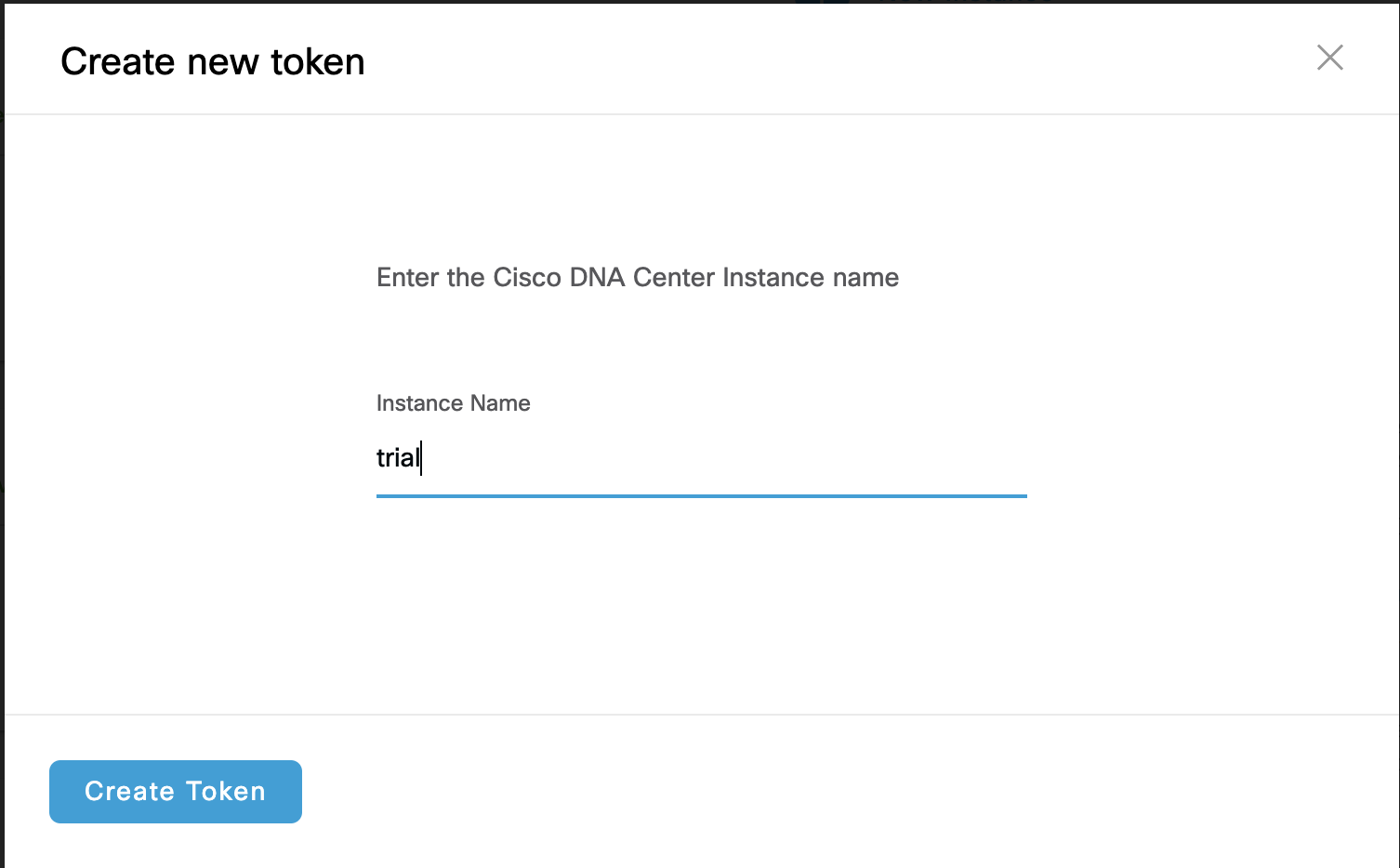 In the Create new token dialogue box, in the Instance Name field, enter the Cisco DNA Center instance name, and click Create Token.