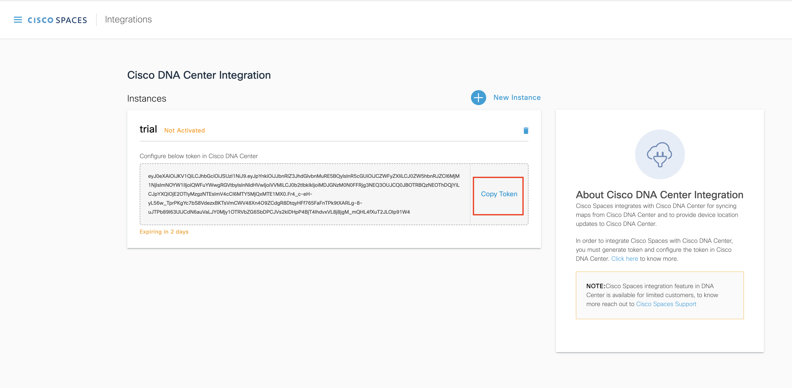 In the Integrate Cisco Spaces dialogue box, paste the token, and click Connect.